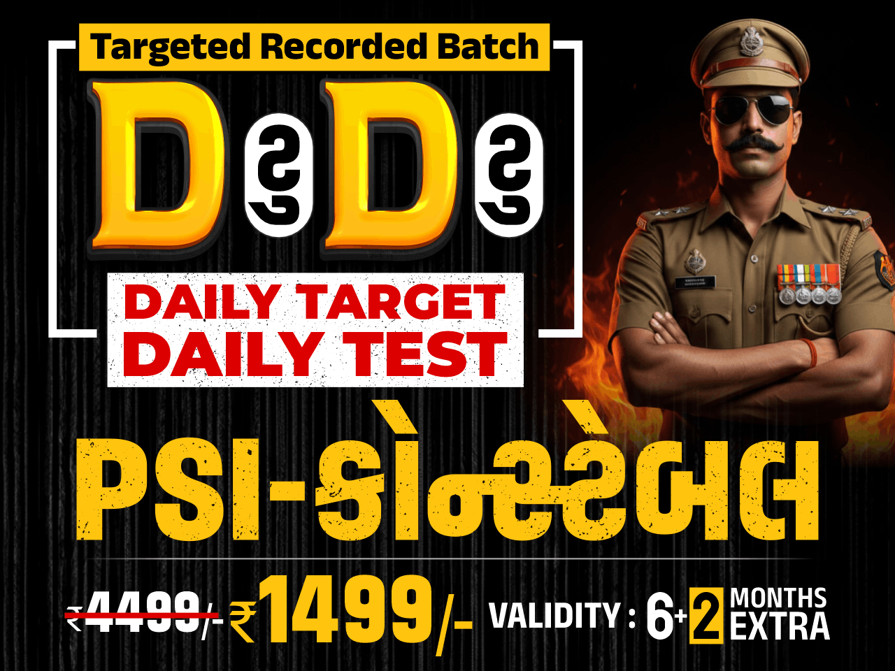 📘 ઓફલાઈન ક્લાસ અને LIVE Batch જેવી જ Targeted Recorded Batch એટલે… D ટુ D ટુ – DAILY TARGET DAILY TEST (PSI–કોન્સ્ટેબલ) Validity :- 6 + 2 Months Extra કોર્ષની માહિતી કે વિશેષતા : 👇 ➤ સિલેબસમાં ગણિત-રિઝનિંગ, બંધારણ જેવા વધુ માર્ક્સ ધરાવતા વિષય ઉપર શરૂઆતથી વિશેષ ધ્યાન આપવામાં આવશે. ➤ એક રેકોર્ડેડ બેચમાં 12 થી વધુ નિષ્ણાત ફેકલ્ટીનો સમાવેશ ➤ Daily Lecture, Daily Material (Printable) અને Daily Test (Printable + Digital)નો સમાવેશ ➤ GK ના વિશેષ અલગથી લેક્ચરનો પણ સમાવેશ ⏰ ડિસ્કાઉન્ટ માત્ર 17 જાન્યુઆરી, 2026 સુધી જ ઉપલબ્ધ છે! નોંધ: - કોઈ પણ સંજોગો માં Fees પરત મળશે નહિ. - Applicationને લગતા સંપૂર્ણ નિર્ણયો, નિયમો અને શરતો સંસ્થાને આધીન રહશે. - કોઈ પણ સંજોગોમાં Payment Return મળશે નહિ. 📲 Application Helpline: 📞 93773-01110 (10 AM – 06 PM)